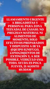 BUENOS DIAS, LLAMAMIENTO URGENTE A BRIGADISTAS Y PERSONAL PARA ZONA TEIXADAL DO CASAIO. NO PRECISAN MATERIAL NI ALIMENTOS DE MOMENTO, SOLO EFECTIVOS PREPARADOS Y DISPUESTO A IR YA (EQUIPO IGNIFUGO, CONOCIMIENTOS DE EXTINCIÓN Y, A SER POSIBLE, VEHICULO 4X4).